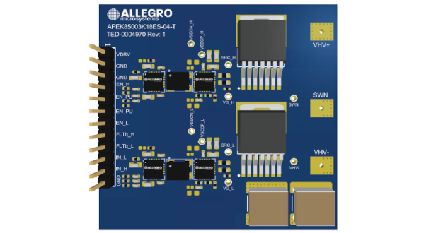 The Allegro MicroSystems APEK85003K18ES-04-MH is an evaluation board for the AHV85003 and AHV85043 isolated SiC driver chipset. This driver provides a self-powered isolated gate drive solution for SiC FETs.