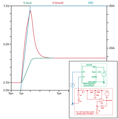Patented on-chip shield circuitry reduces output errors due to high-voltage switching (high dv/dt). Additionally, the Hall-effect sensing method is immune to inductance spikes from high di/dt events, unlike most shunt plus op-amp solutions.