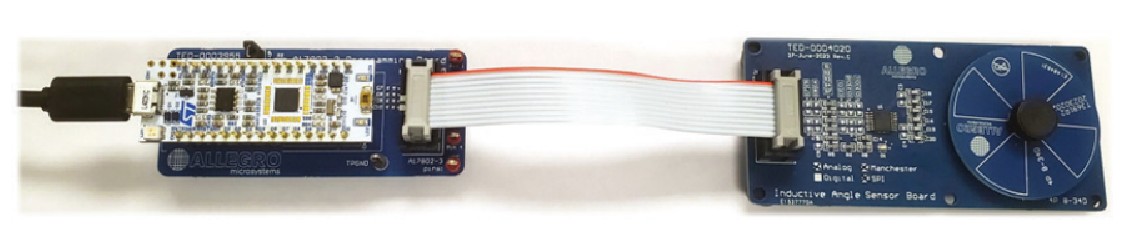 The A17802 evaluation kit provides an easy way to evaluate the Allegro A17802 integrated circuit (IC) using a computer running Microsoft Windows. The downloadable demonstration application provides a graphical user interface (GUI) that displays the measured angle from the A17802 and provides configuration control using Manchester or SPI protocols.