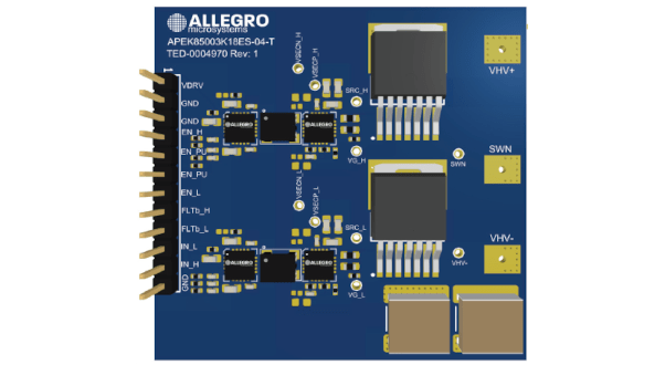 The Allegro MicroSystems APEK85003K18ES-04-MH is an evaluation board for the AHV85003 and AHV85043 isolated SiC driver chipset. This driver provides a self-powered isolated gate drive solution for SiC FETs.