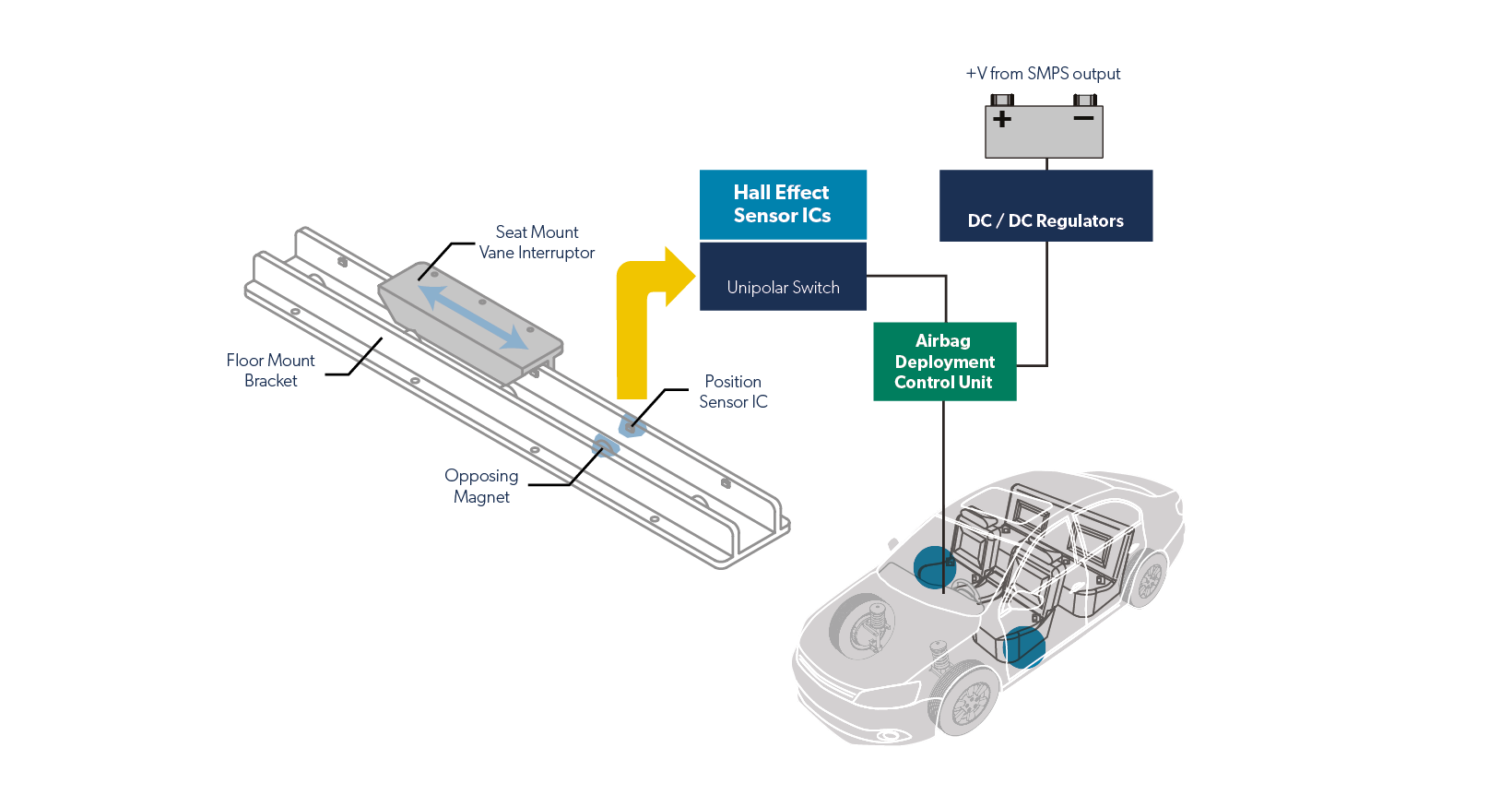 我们的数字位置传感器提供了独特功能来帮助安全要求极高的系统满足 ISO 26262 准则。 卓越的 OEM 和一级供应商将我们的霍尔效应开关放心用于座椅位置应用。