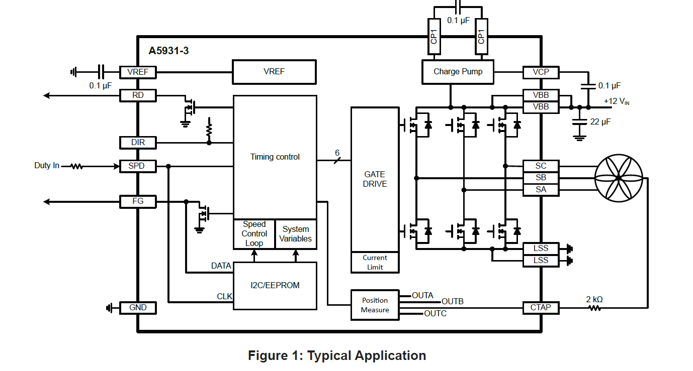 - 根据 Allegro 的无传感器算法获得电机位置,无需外部霍尔传感器